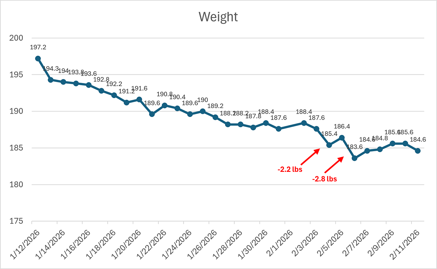 197.2 lbs —> 184.6 lbs (-12.6)