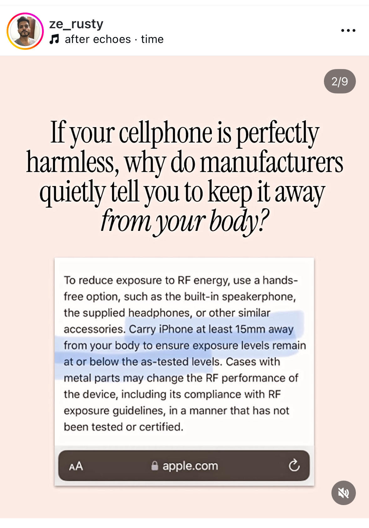 The fine print of your iPhone even says to hold your device at least 15mm from your body for “safe” radiation exposure (see below).