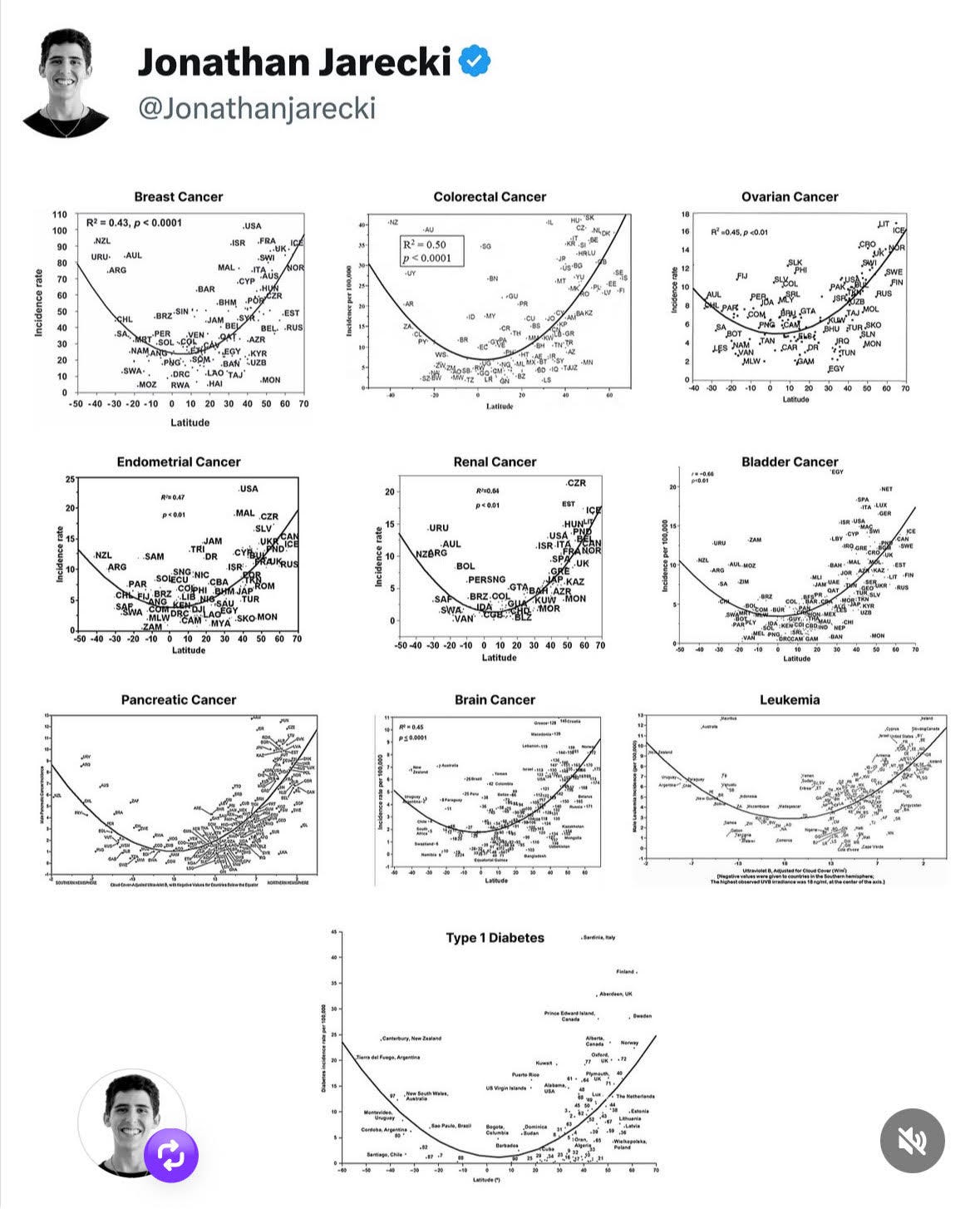 Rates of chronic disease such as multiple sclerosis, breast cancer, melanoma, and diabetes DECREASE the closer you get to the equator, where UV light is the strongest year-round.