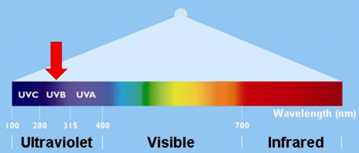 UVB is defined as light from 280 to 315 nanometers. It’s the strongest form of light we get from the sun (UVC is stronger but doesn’t penetrate past the stratosphere).
